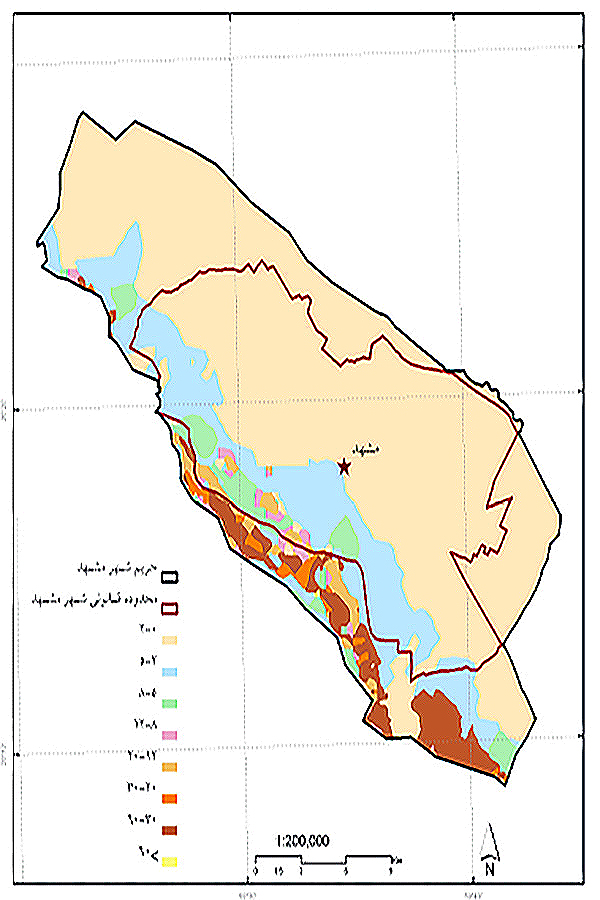 - مشهد در نواحی گسترش یافته در قسمت غربی و جنوبی که به دامنه ارتفاعات پیوند خورده است دارای شیب های تند تری نسبت به دیگر محدوده های شهر میباشد